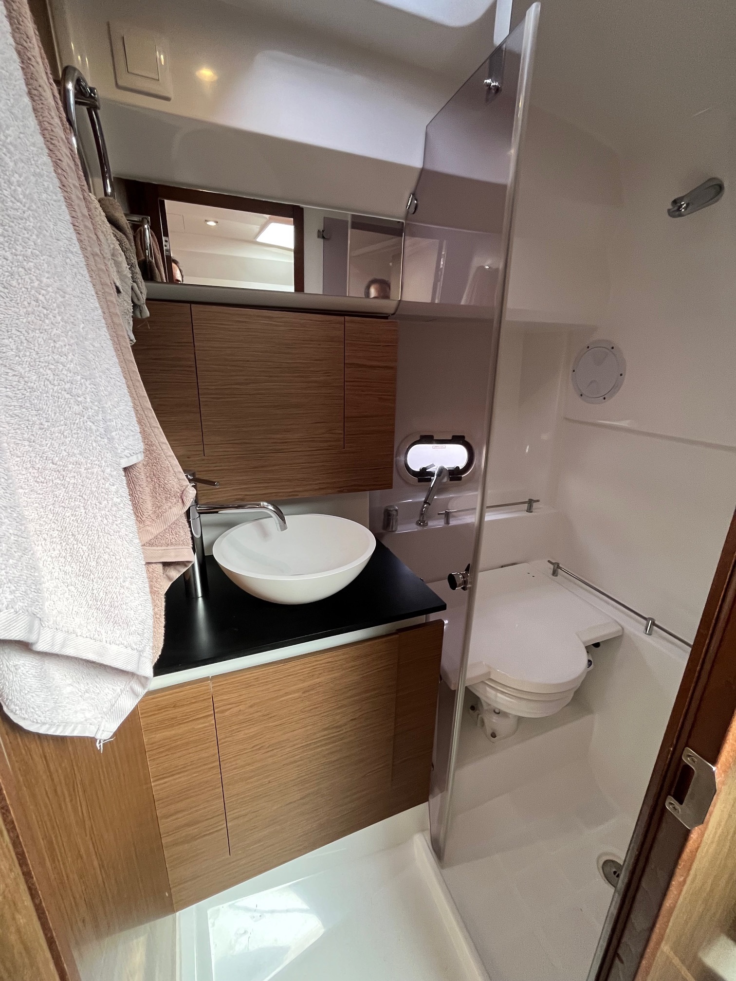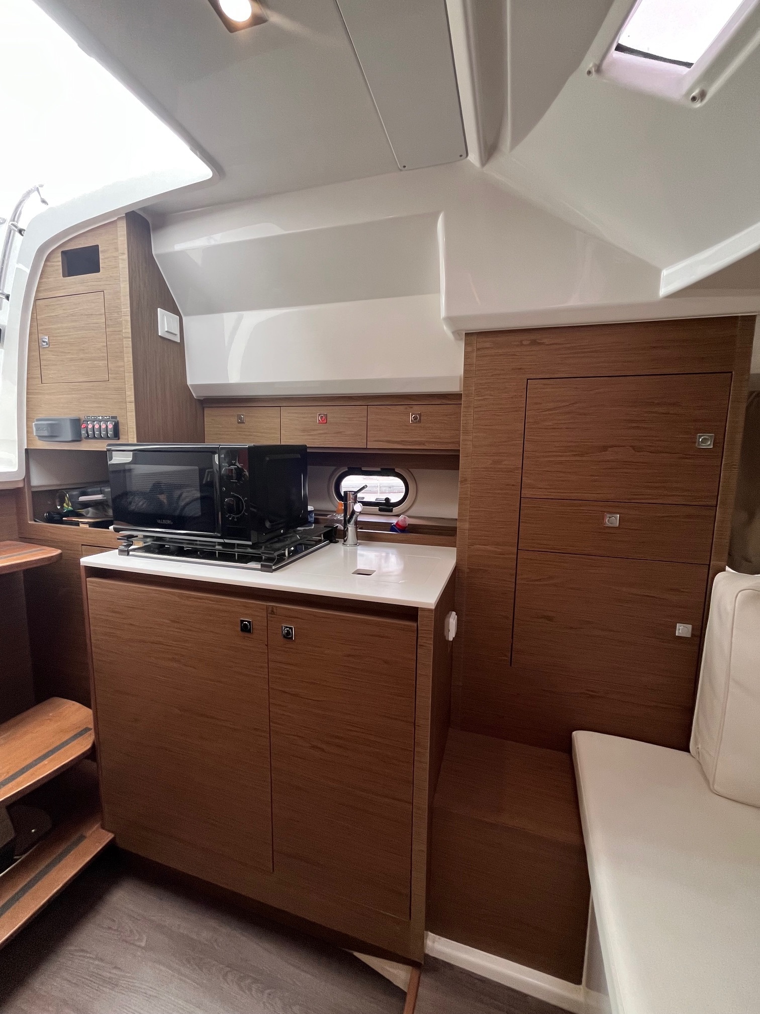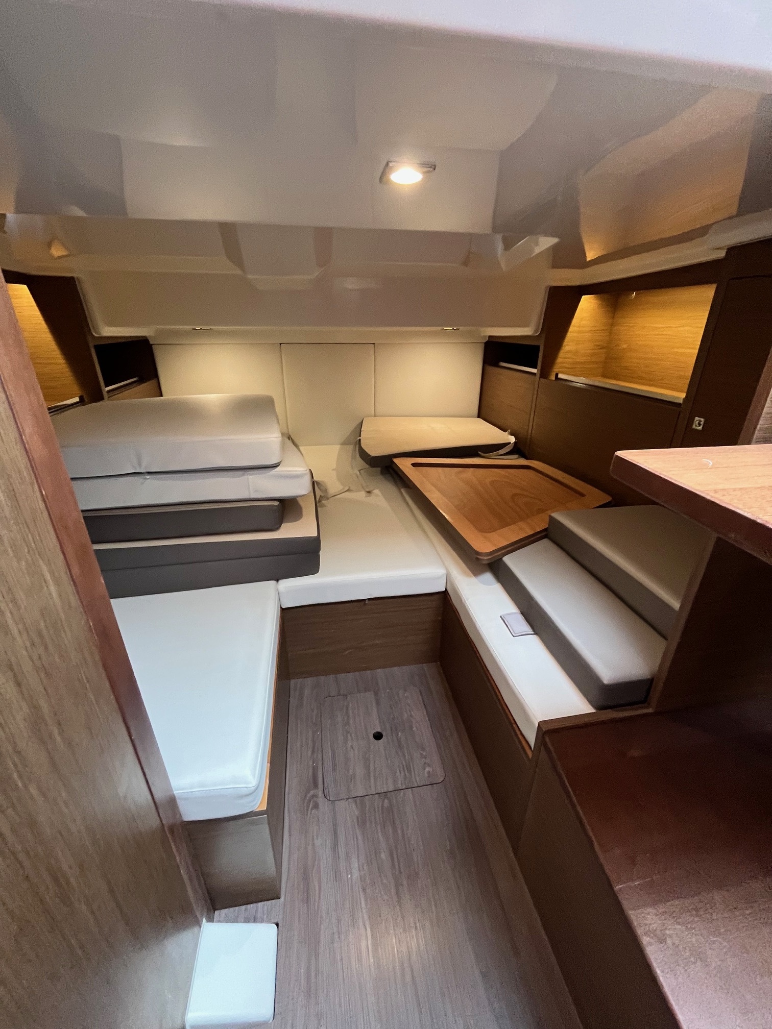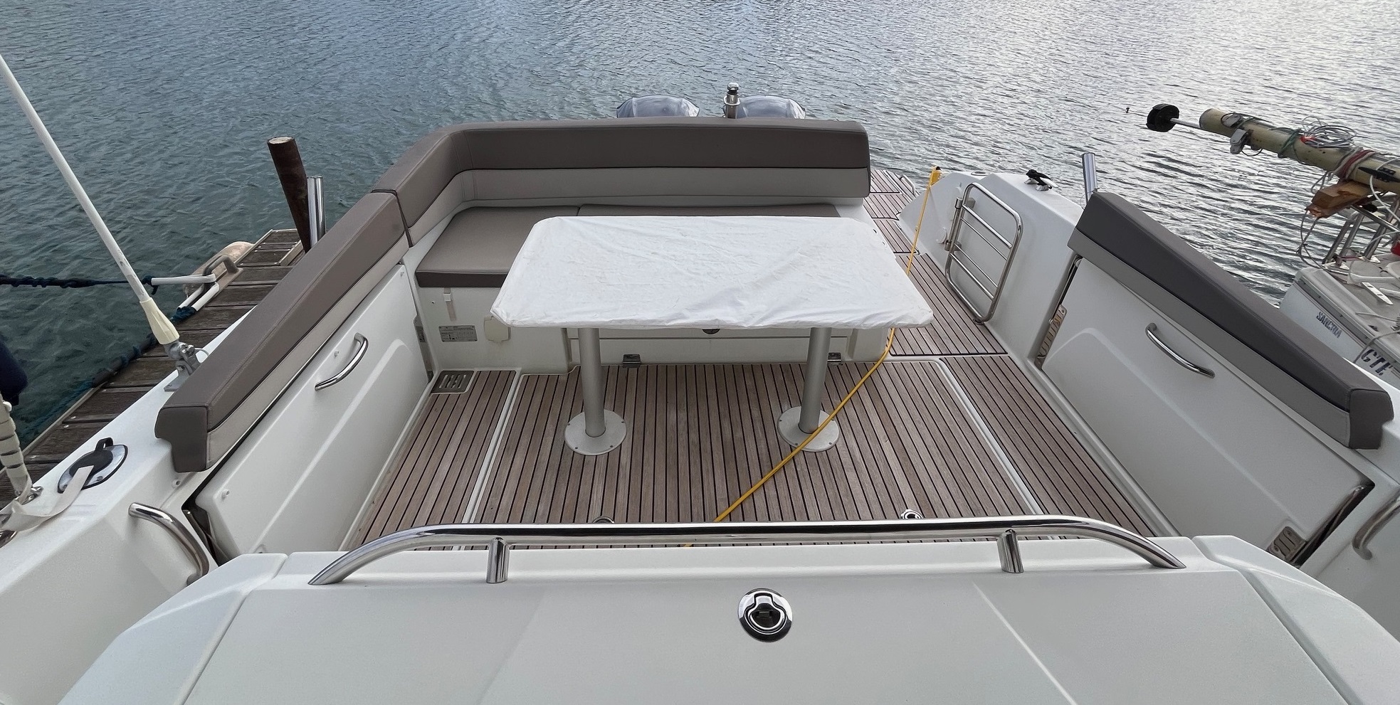 Finition 1ere, guindeau électrique, vhf, bain de soleil avant, banquette latérale, cabriolet, taud de mouillage, double écran gps-sondeur Humminbird, eau chaude , couchage carré, cockpit et plateforme en teck, mat de ski, table de cockpit en teck, douchette de bain.
